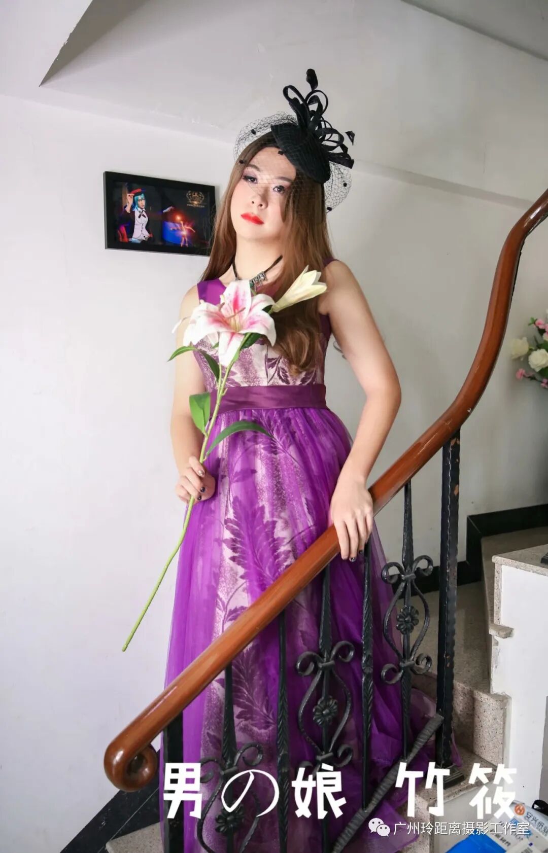 第2套是礼服。秀丽的长发下是一张忧郁的面容,头上的黑色发饰遮挡不住竹筱眼神中的哀伤。惊艳的紫色长裙礼服,踢踢踏踏作响的高跟鞋,作为名媛的竹筱无法决定自己的命运,变成女人的竹筱流连在灯红酒绿的世界,但是他的心却一直期盼同样身着长裙的他,竹筱多么羡慕手中的百合花,忘我地绽放。