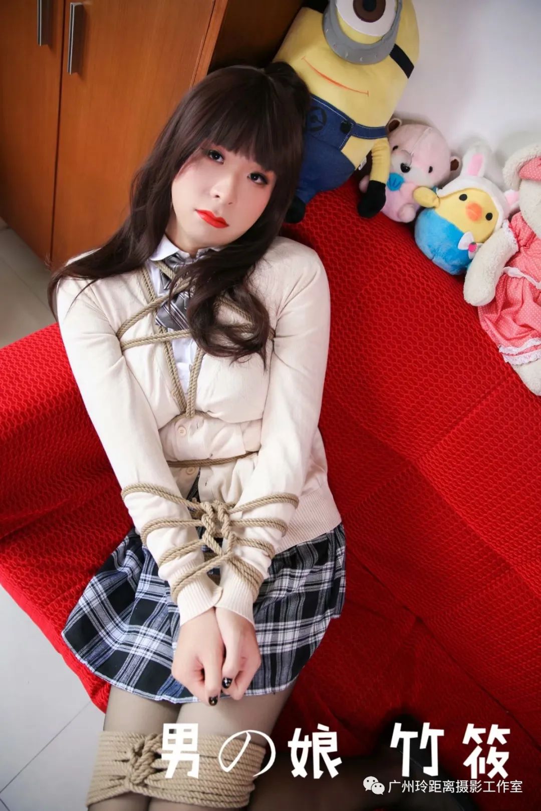 第1套是学生装。竹筱是一名男高中生,但是他在校服之下穿着黑色连裤袜,因为他有一颗变成女高中生的心。一直小心翼翼的竹筱终于有一天被发现了秘密,愤怒的老师将竹筱的校服扒光,羞辱般地给他换上了女生高中校服,女士学生衬衣,格子百褶裙和脸上的浓妆,腿上的黑丝显得格格不入。被惩罚的竹筱被绳子困住双手双腿,无助地困坐在办公室的沙发上,被来来往往的老师同学围观,等待着被通知的父母。